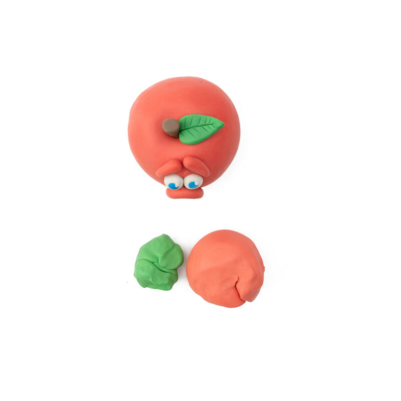 Geef elk kind een stuk klei, eventueel in verschillende kleuren. Laat ze eerst vrij experimenteren: hoe blijft de klei zitten op het fruit? Wat kunnen ze vormen?